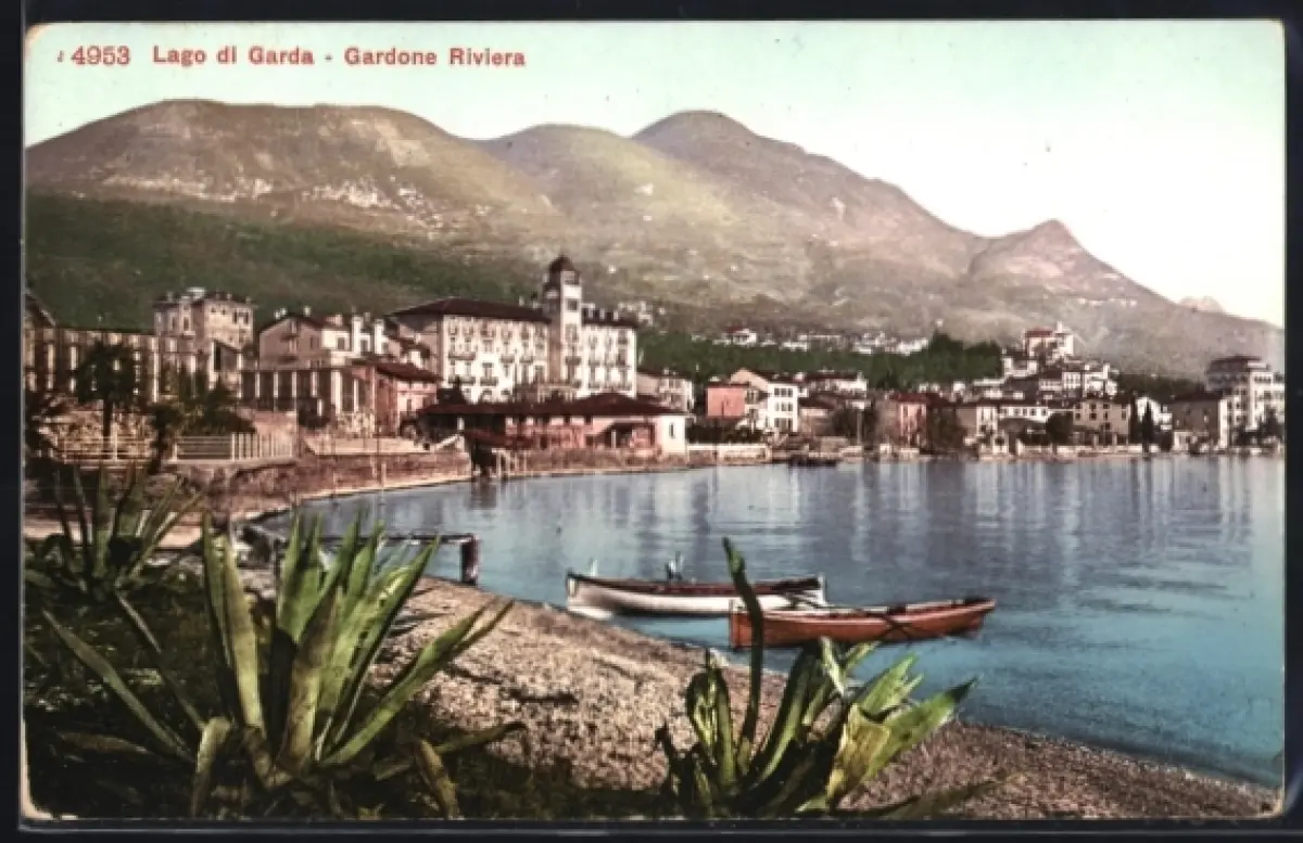 AK Gardone Riviera, Blick zum Ort, Ruderboote