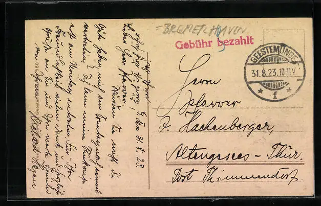 alte Ansichtskarte, gelaufen 1923 als Feldpost, Eckknick unten re., guter Zustand
