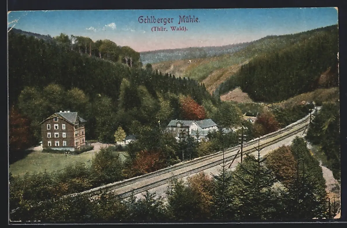 AK Gehlberg, Blick über die Eisenbahnlinie auf die Mühle