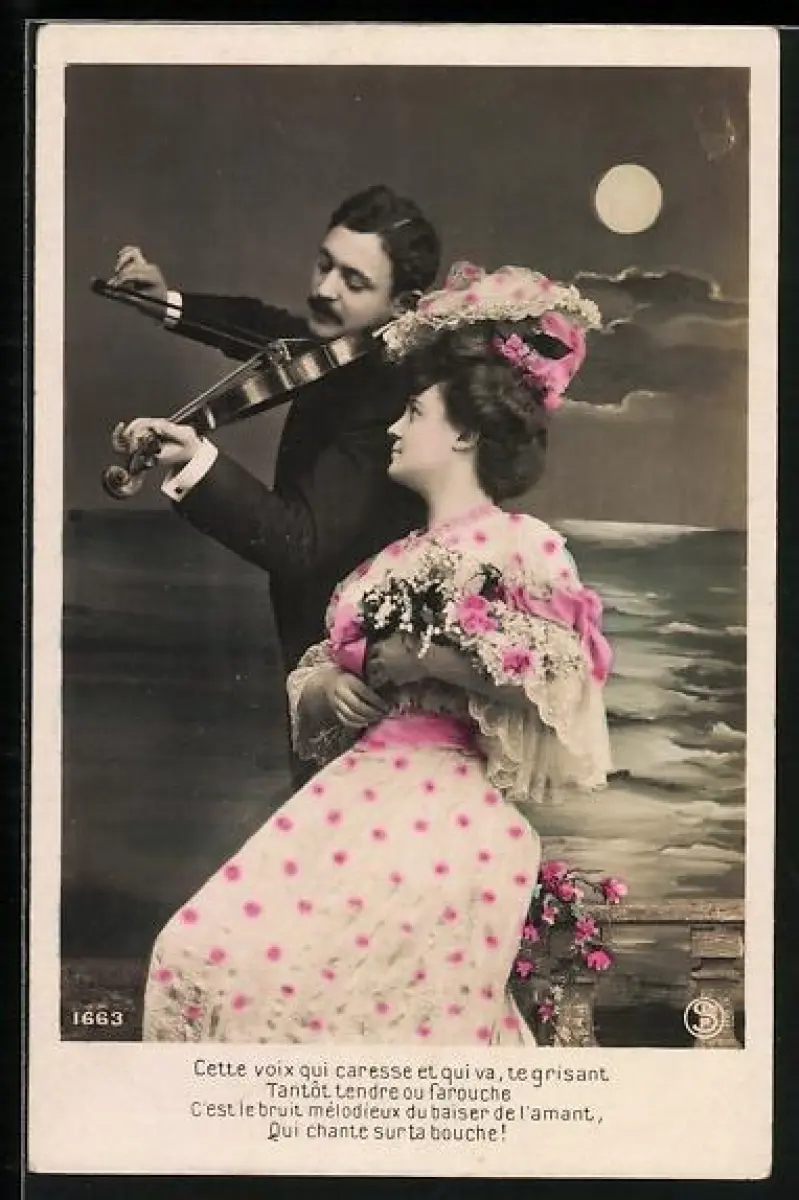 AK Geiger gibt junger Dame ein Ständchen bei Vollmond am Meer