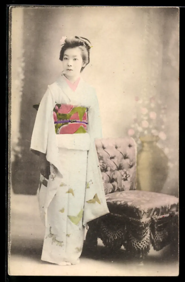 AK Geisha neben einem Sessel