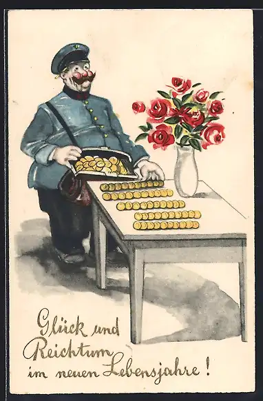 AK Geldbote zahlt Geldstücke aus seiner Geldtasche aus, Geburtstag
