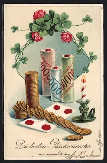 AK Geldmünzen und Kuvert mit Kleeblättern, Neujahrsgruss