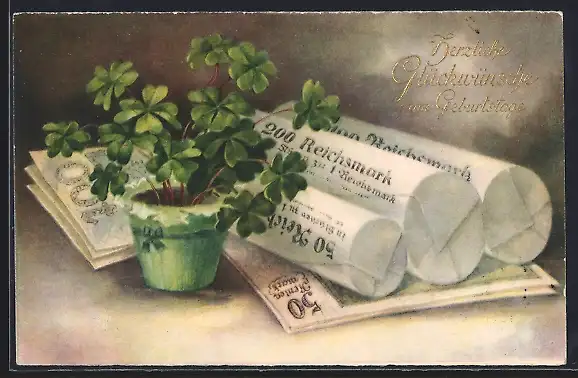 AK Geldrollen und Scheine an Blumentopf mit Kleeblättern, Glückliches Neujahr