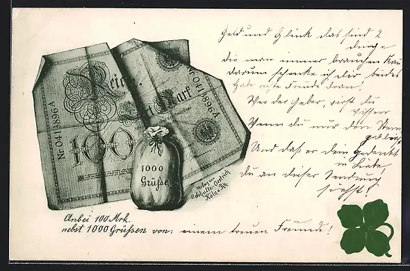 AK Geldschein 100 Mark, Sack mit 100 Grüssen, Präge-Kleeblatt