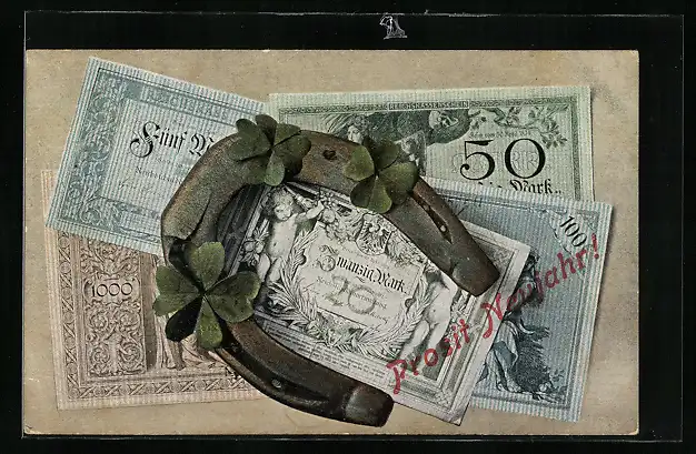 AK Geldscheine, Hufeisen und Kleeblätter