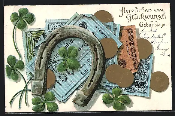 AK Geldscheine u. -Münzen, mit vierblättrigen Kleeblättern u. Hufeisen