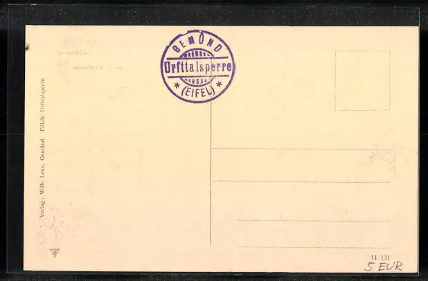Personenbezogene Daten auf der Rückseite der Karte wurden durch blauen Textmarker unkenntlich gemacht. Die blauen Stellen sind auf die Vorderseite durchgeweicht und wirken sich negativ auf das Postkartenfoto aus
