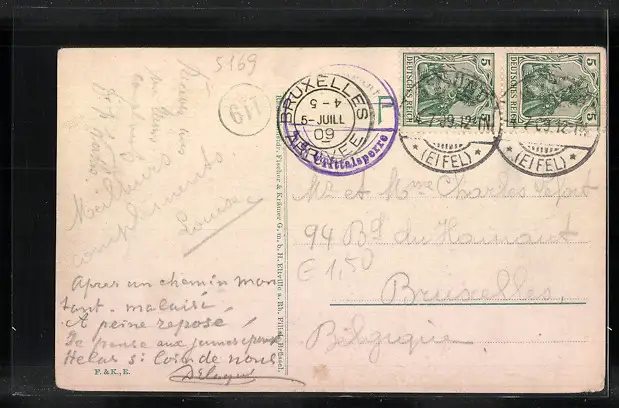 Personenbezogene Daten auf der Rückseite der Karte wurden durch blauen Textmarker unkenntlich gemacht. Die blauen Stellen sind auf die Vorderseite durchgeweicht und wirken sich negativ auf das Postkartenfoto aus