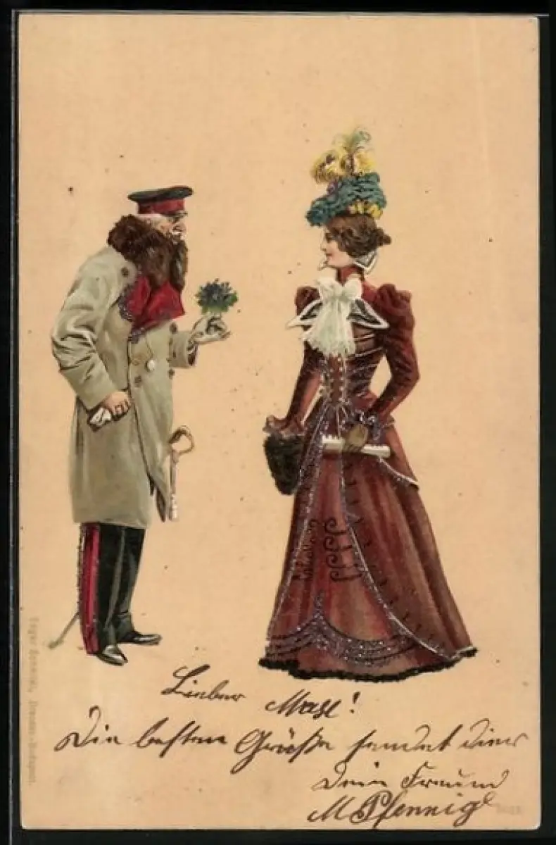 AK General in niform überreicht Dame einen Blumenstrauss Vergissmeinnicht