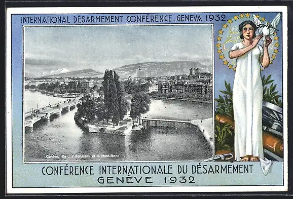 AK Genève, Conférence Internationale du Désarmement 1932, Stadtpanorama, Passepartout mit Friedenstaube