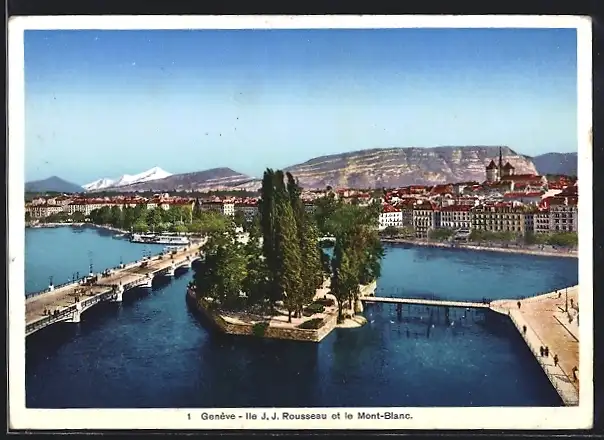 AK Genève, Ile J. J. Rousseau et le Mont-Blanc