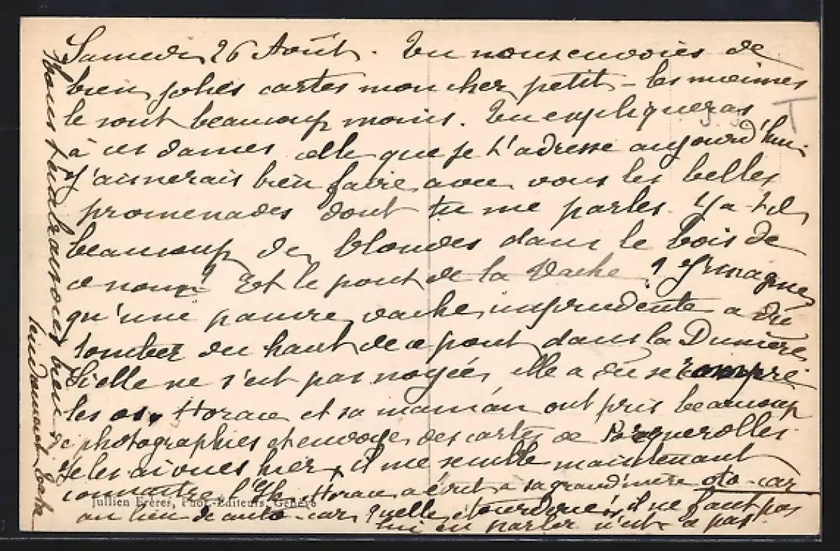 Personenbezogene Daten auf der Rückseite der Karte wurden durch blauen Textmarker unkenntlich gemacht. Die blauen Stellen sind auf die Vorderseite durchgeweicht und wirken sich negativ auf das Postkartenfoto aus