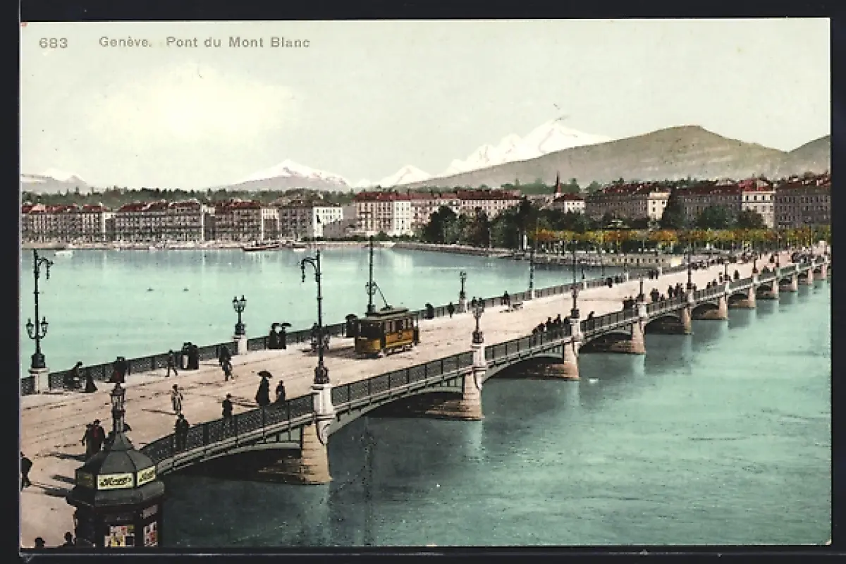 AK Genève, Pont du Mont Blanc, Strassenbahn
