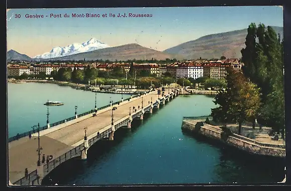 AK Genève, Pont du Mont-Blanc et Ile J.-J. Rousseau