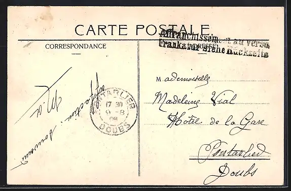 Personenbezogene Daten auf der Rückseite der Karte wurden durch blauen Textmarker unkenntlich gemacht. Die blauen Stellen sind auf die Vorderseite durchgeweicht und wirken sich negativ auf das Postkartenfoto aus