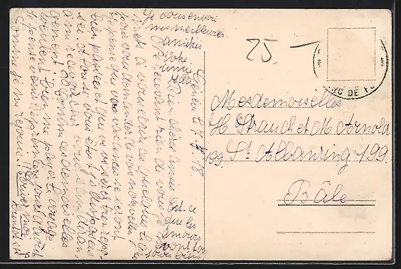 Personenbezogene Daten auf der Rückseite der Karte wurden durch blauen Textmarker unkenntlich gemacht. Die blauen Stellen sind auf die Vorderseite durchgeweicht und wirken sich negativ auf das Postkartenfoto aus