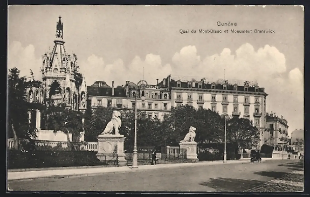 AK Genève, Quai du Mont-Blanc et Monument Brunswick