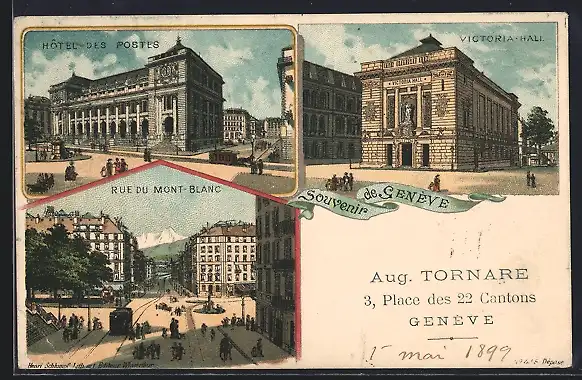 AK Geneve, Rue du Mont-Blanc, Hotel des Postes, Victoria-Hall um 1900