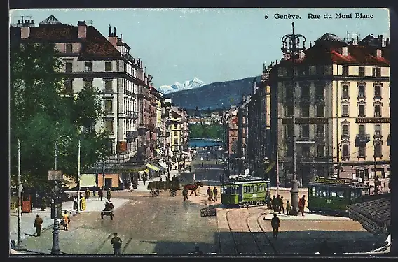 AK Genève, Rue du Mont Blanc, Strassenbahn