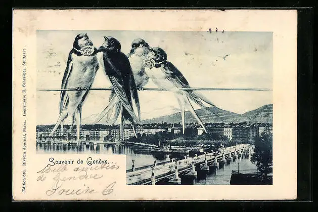 AK Genf, Schwalben auf einer Leitung vor Panorama der Stadt