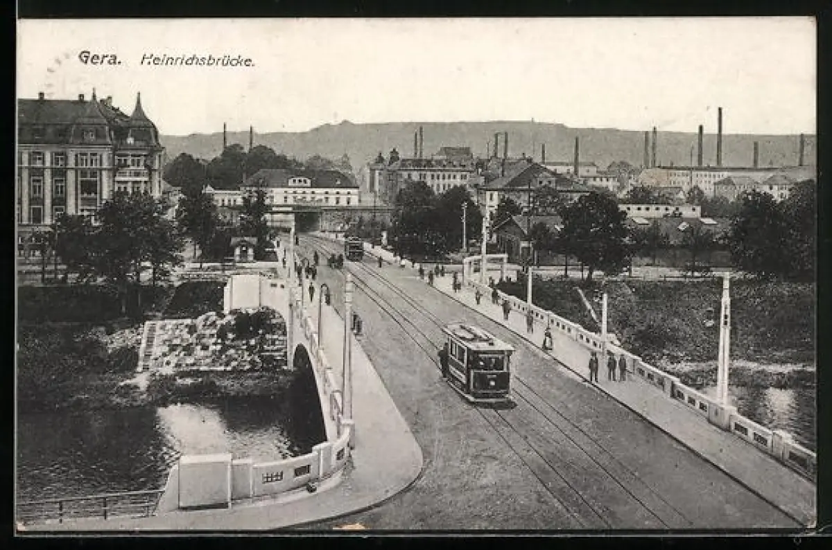 AK Gera, Heinrichsbrücke mit Strassenbahn aus der Vogelschau