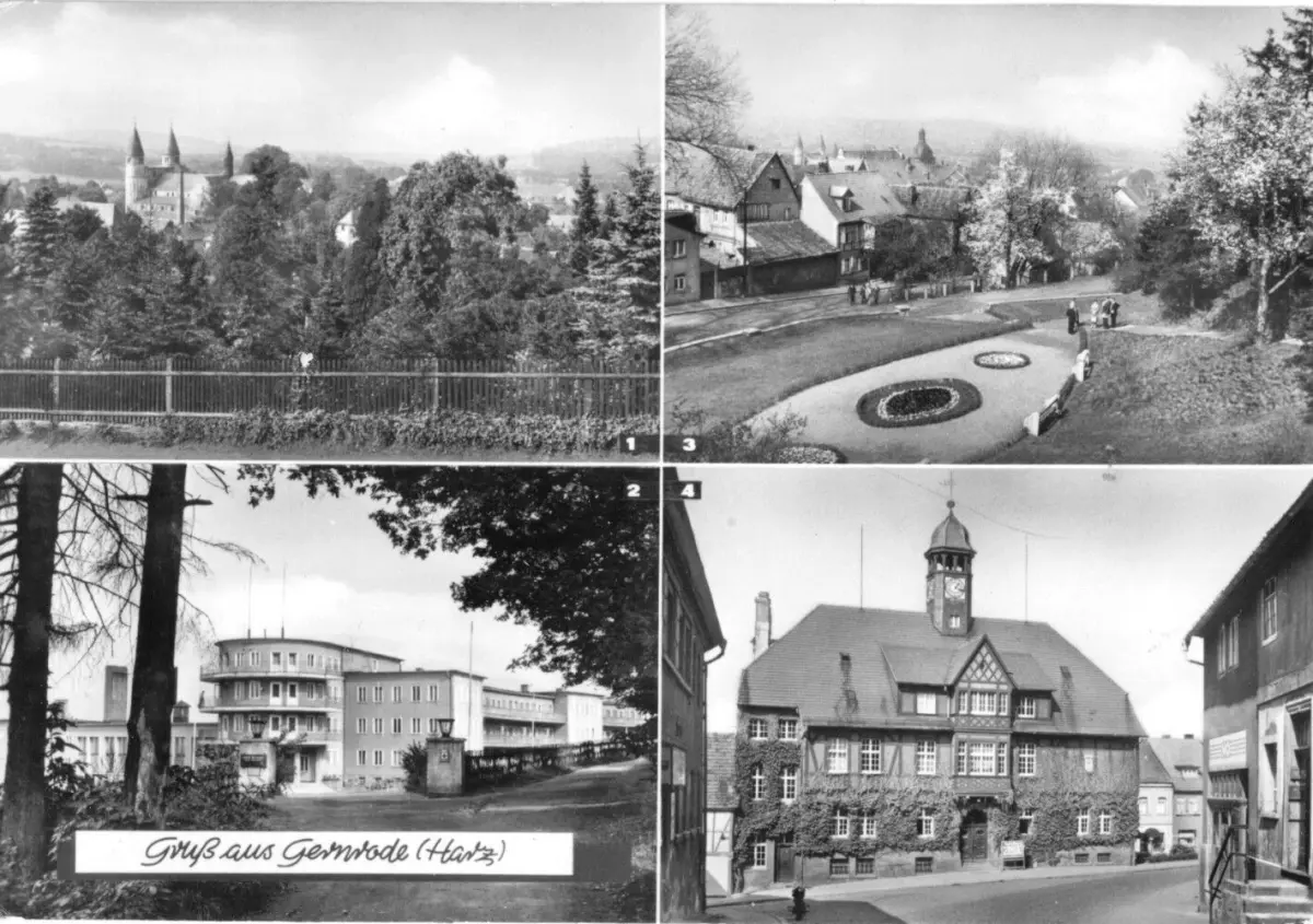 Ansichtskarte Gernrode Harz vier Abb. - Stiftskirche St. Cyriakus, FDGB-Heim "Fritz Heckert", Kurpark, Rathaus Erhaltung I-II ungelaufen Druckvermerk: 1968 Herstellungsland: DDR Verlag: Heldge-Verlag KG, 437 Köthen Anhalt - 9776