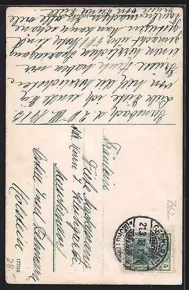 Personenbezogene Daten auf der Rückseite der Karte wurden durch blauen Textmarker unkenntlich gemacht. Die blauen Stellen sind auf die Vorderseite durchgeweicht und wirken sich negativ auf das Postkartenfoto aus
