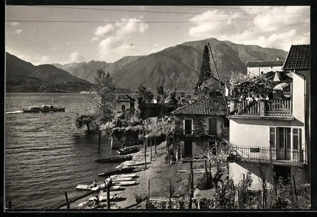 AK Gerra /Lago Maggiore, Uferpartie mit Gebirgspanorama, Ausflugsboot auf dem See