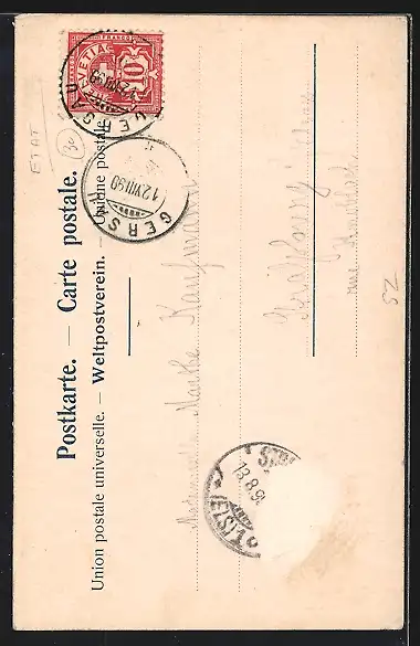 gelaufen 1899, Briefmarke entfernt, rückseitig Oberflächenschaden, Eckknick li. unten, guter Zustand