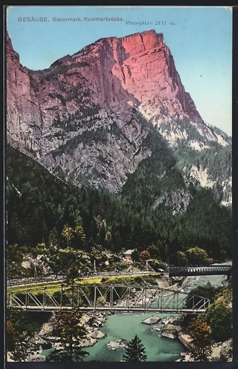 AK Gesäuse, Kummerbrücke mit Planspitze, österreichische Eisenbahn