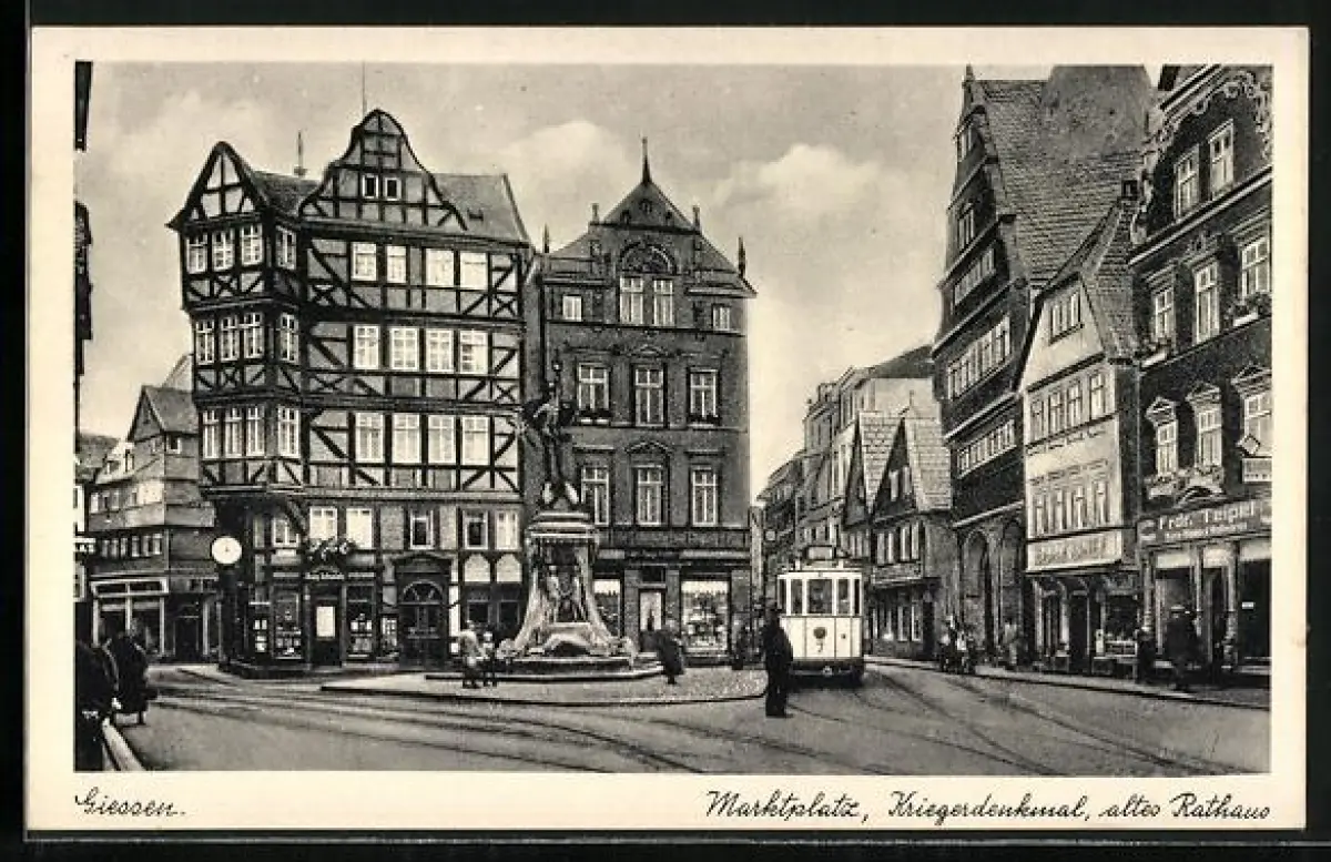 AK Giessen, Marktplatz, Kriegerdenkmal, altes Rathaus, Strassenbahn