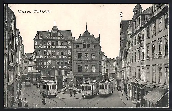 AK Giessen, Marktplatz mit Denkmal und Strassenbahn