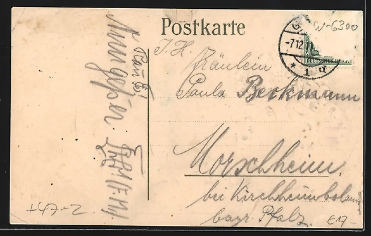 alte Ansichtskarte, gelaufen, Briefmarke entfernt, reparierter Einriss obere Kante, Eckknicke rechts