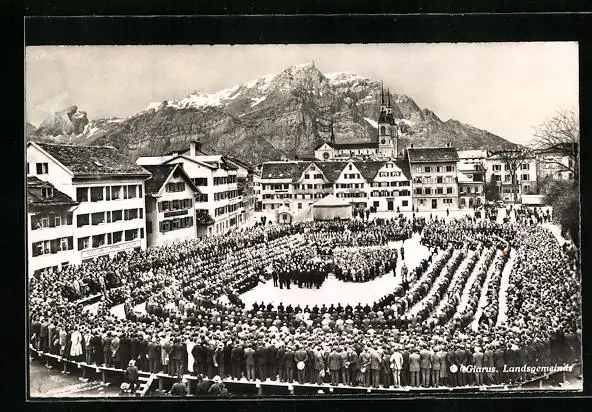AK Glarus, Ortsansicht mit Versammlung am Marktplatz mit den Alpen im Hintergrund