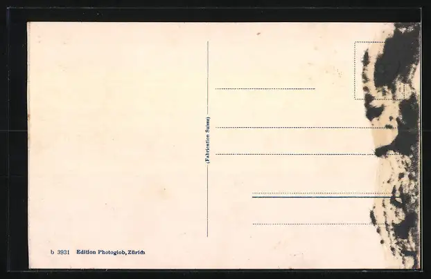 Personenbezogene Daten auf der Rückseite der Karte wurden durch blauen Textmarker unkenntlich gemacht. Die blauen Stellen sind auf die Vorderseite durchgeweicht und wirken sich negativ auf das Postkartenfoto aus