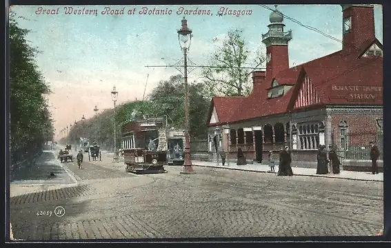 AK Glasgow, Great Western Road at Botanic Gardens, Strassenbahn