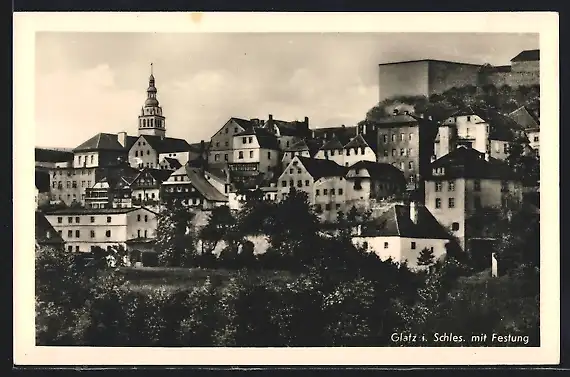 AK Glatz, Ortsansicht mit Blick auf die Festung
