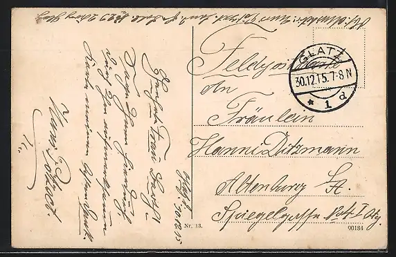 alte Ansichtskarte, gelaufen 1915, Eckknicke li., Bugspur mittig waagerecht, guter Zustand