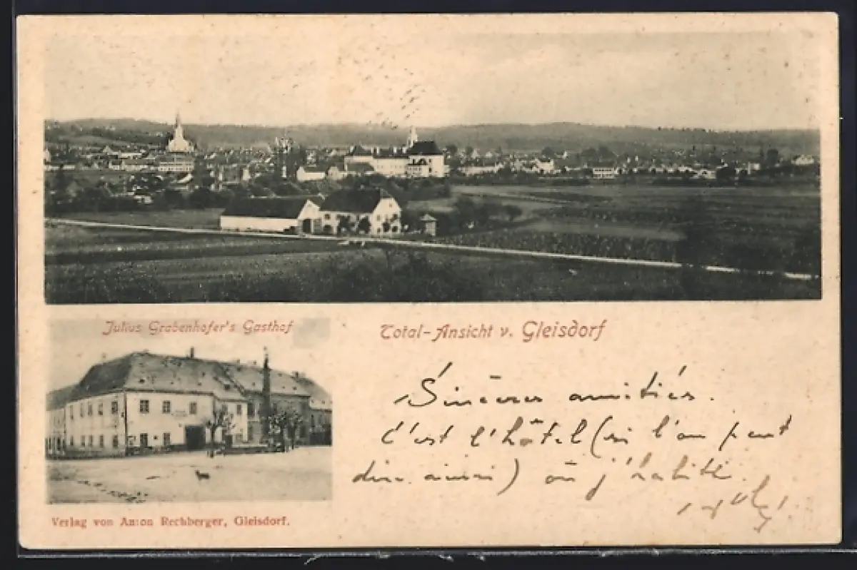 AK Gleisdorf, Julius Garbenhofer`s Gasthof, Ortspanorama