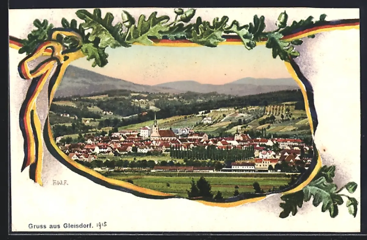 AK Gleisdorf, Ortspanorama mit Eichenlaub-Rahmen