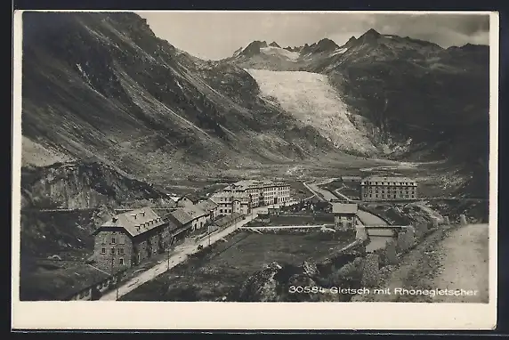 AK Gletsch, Gesamtansicht mit Strasse, Brücken u. Rhonegletscher aus der Vogelschau