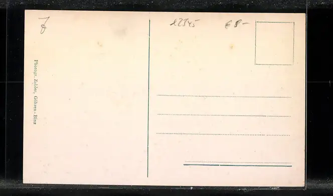 Personenbezogene Daten auf der Rückseite der Karte wurden durch blauen Textmarker unkenntlich gemacht. Die blauen Stellen sind auf die Vorderseite durchgeweicht und wirken sich negativ auf das Postkartenfoto aus