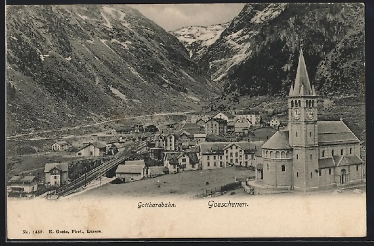 AK Goeschenen, Ortsansicht mit Gotthardbahn