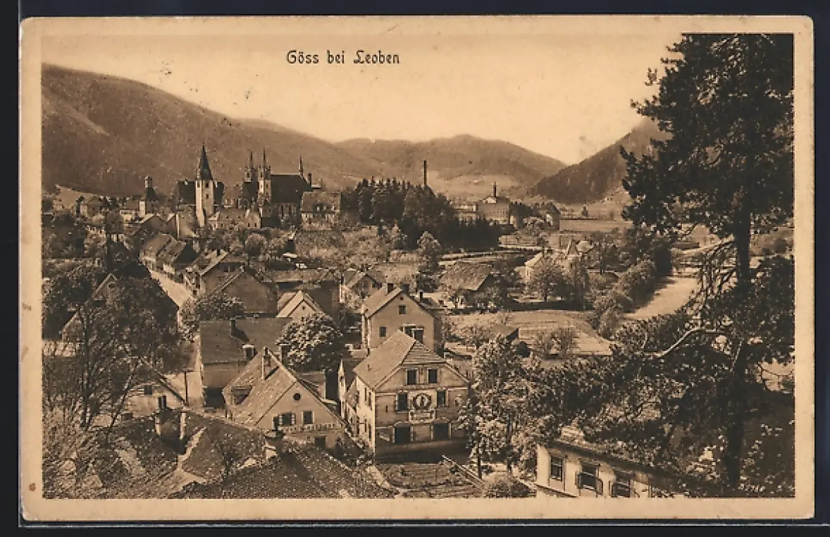 AK Göss / Leoben, Ortsansicht m. Kirche