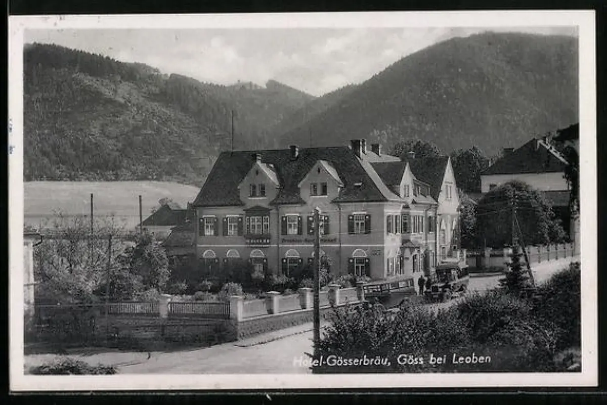 AK Göss bei Leoben, Hotel Gösserbräu und Strassenpartie