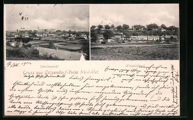 AK Götzendorf-Velm, Blick zur Weinkellerei, Totalansicht vom Ort