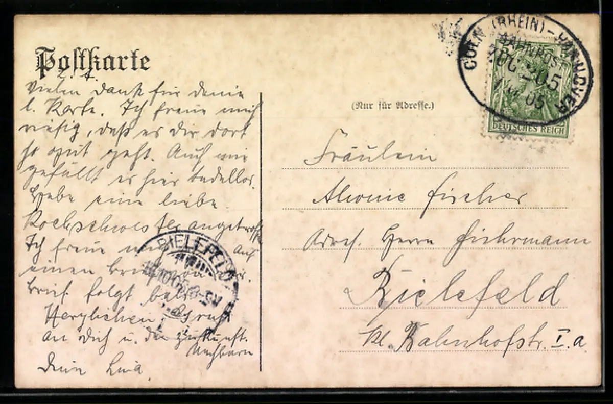 alte Ansichtskarte, gelaufen 1905, Bugspur rechts mittig, Stempelspur, guter Zustand