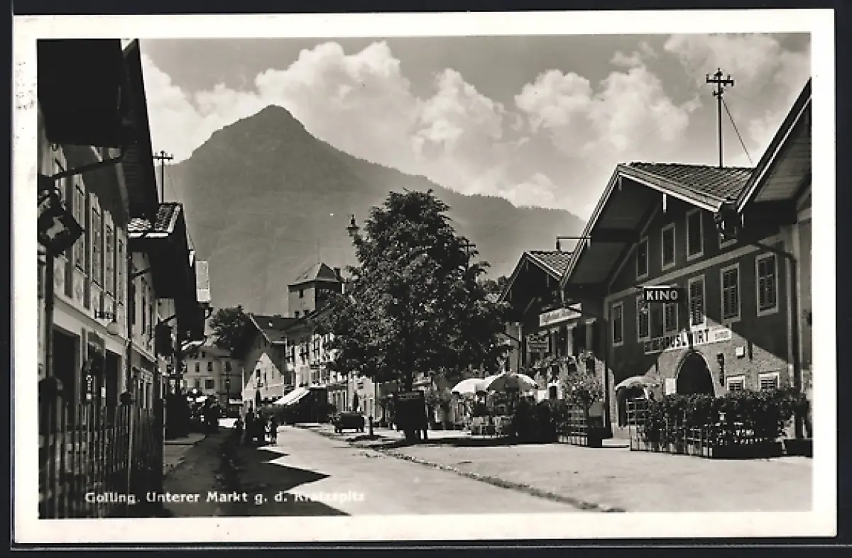 AK Golling, Unterer Markt mit Kino g. d. Kraftspitz