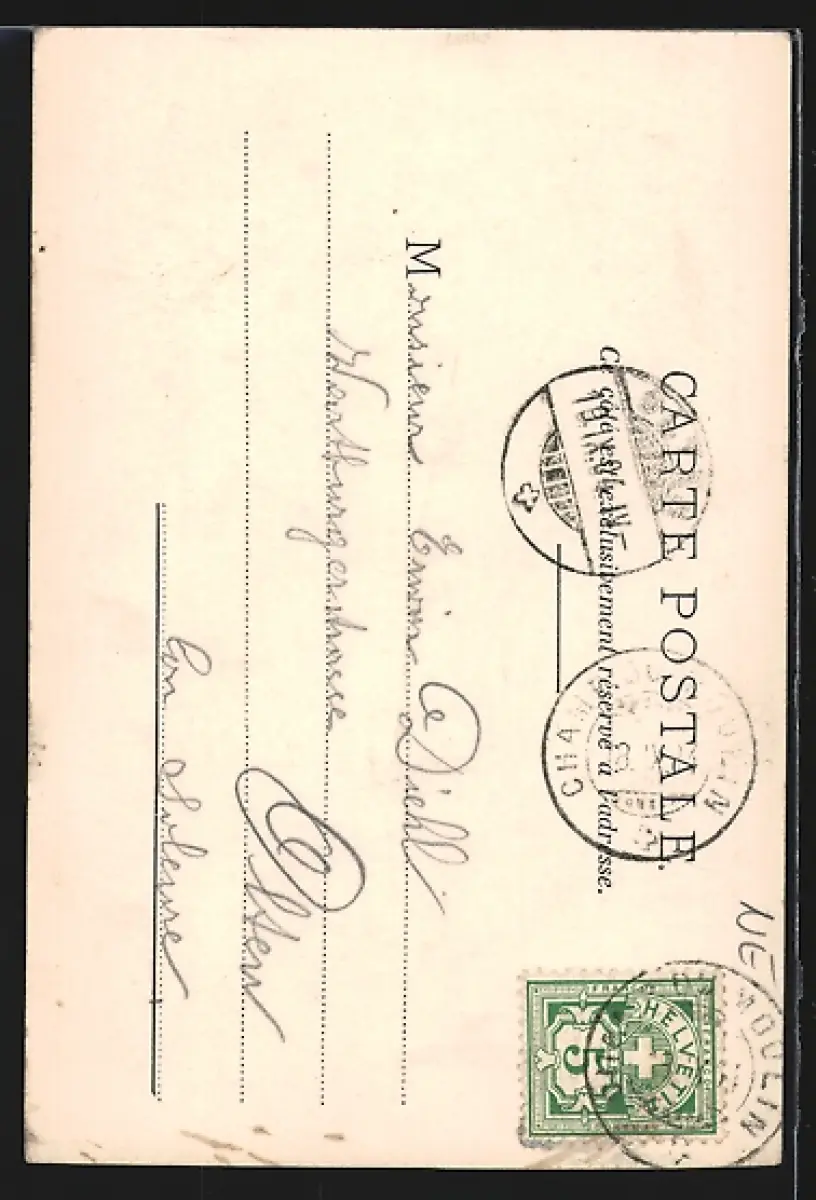 alte Ansichtskarte, gelaufen 1904, Abriebspur oben Mitte u. re., Klebe- und Papierrest oben re., Stempelspur, guter Zustand